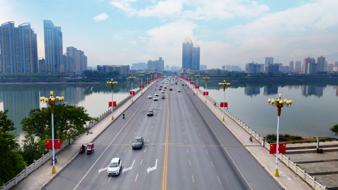 沿著天漢大道、濱江路、北大街、東大街一路飛馳,記者看見整條大街路燈桿上、商戶門頭,一面面鮮艷的國旗,為多彩的城市增添一抹紅色,鮮艷的國旗點綴著街景,熱烈喜慶、歡樂祥和的節日氛圍撲面而來,與綠樹林蔭構成一道靚麗的“風景線”。