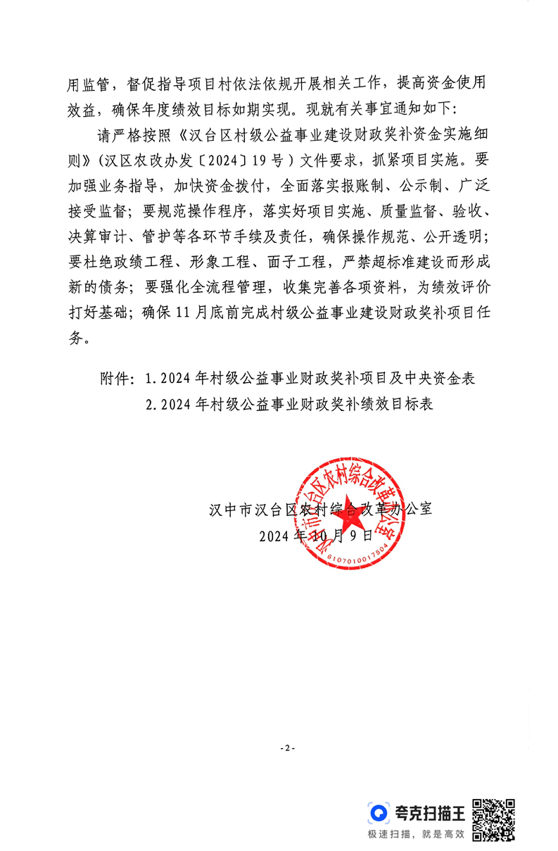 漢中市漢臺區農村綜合改革辦公室關于下達2024年度村級公益事業建設財政獎補項目計劃及獎補資金的通知