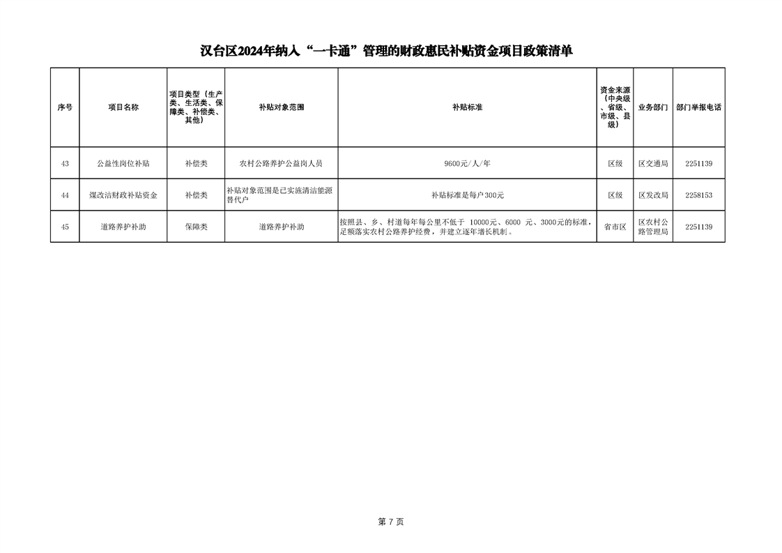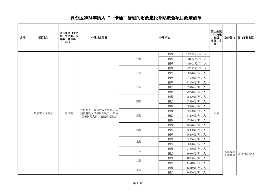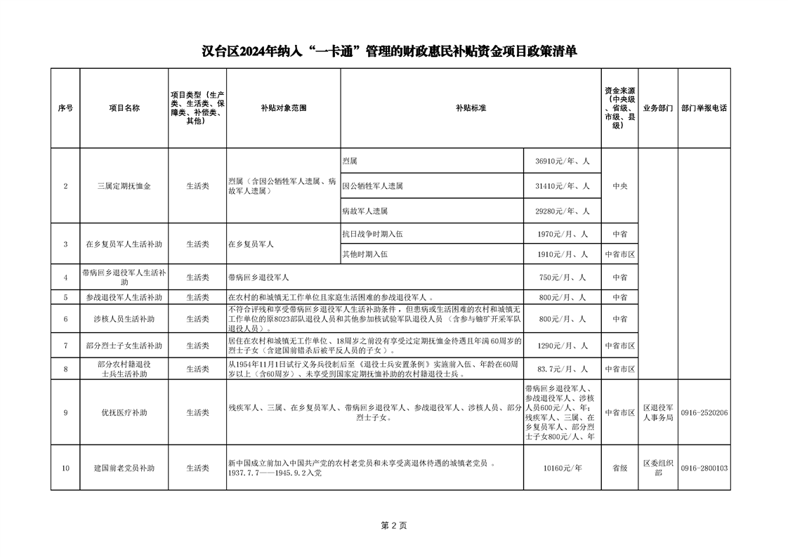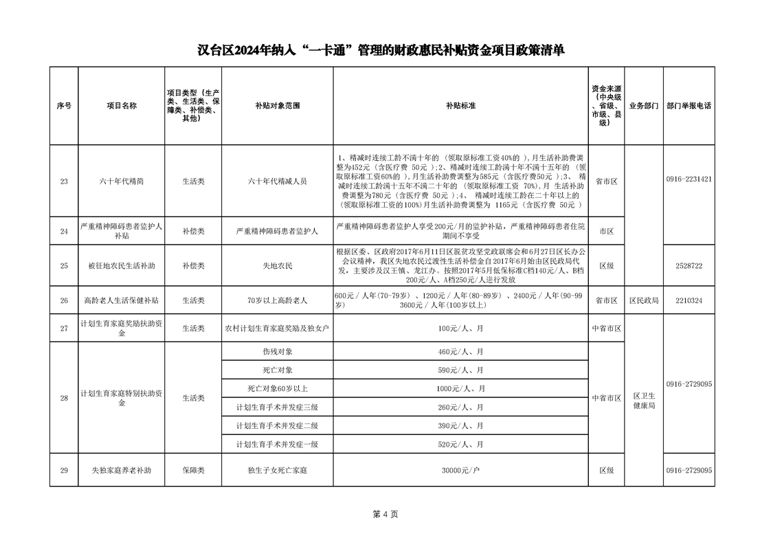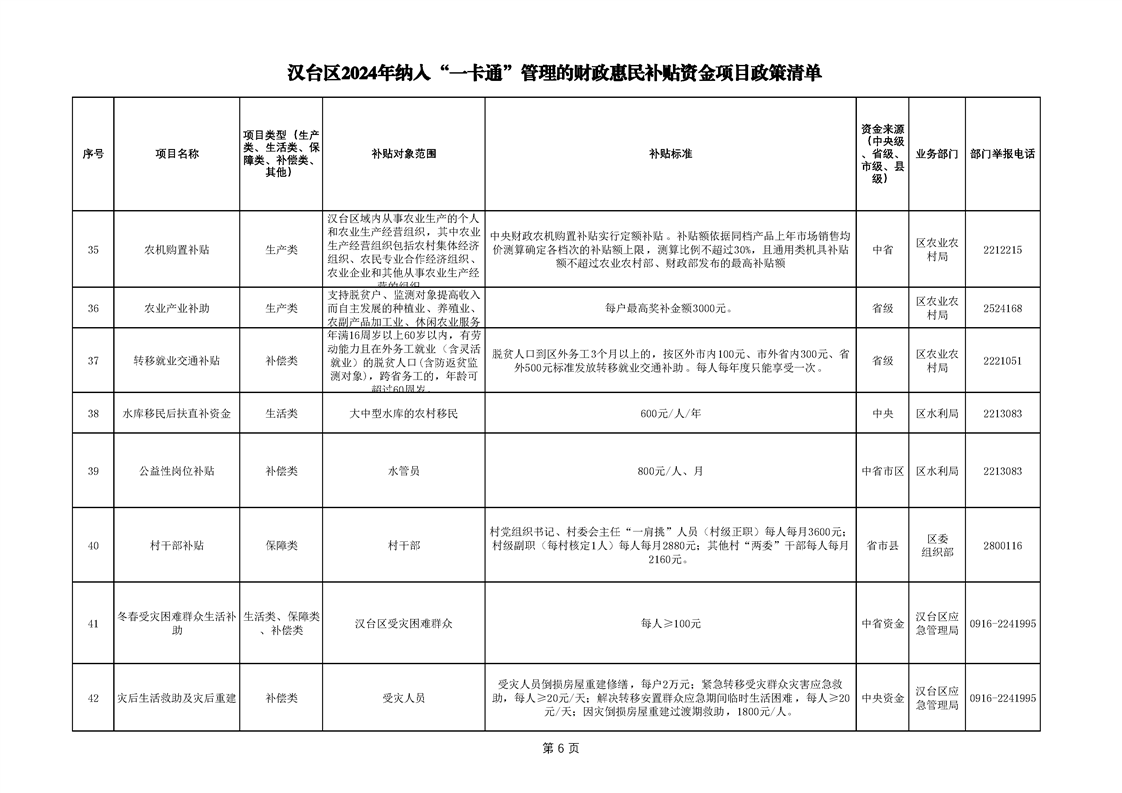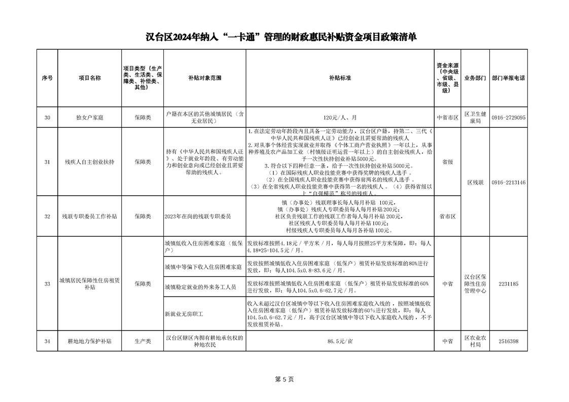 漢臺區2024年納入“一卡通”管理的財政惠民補貼資金項目政策清單