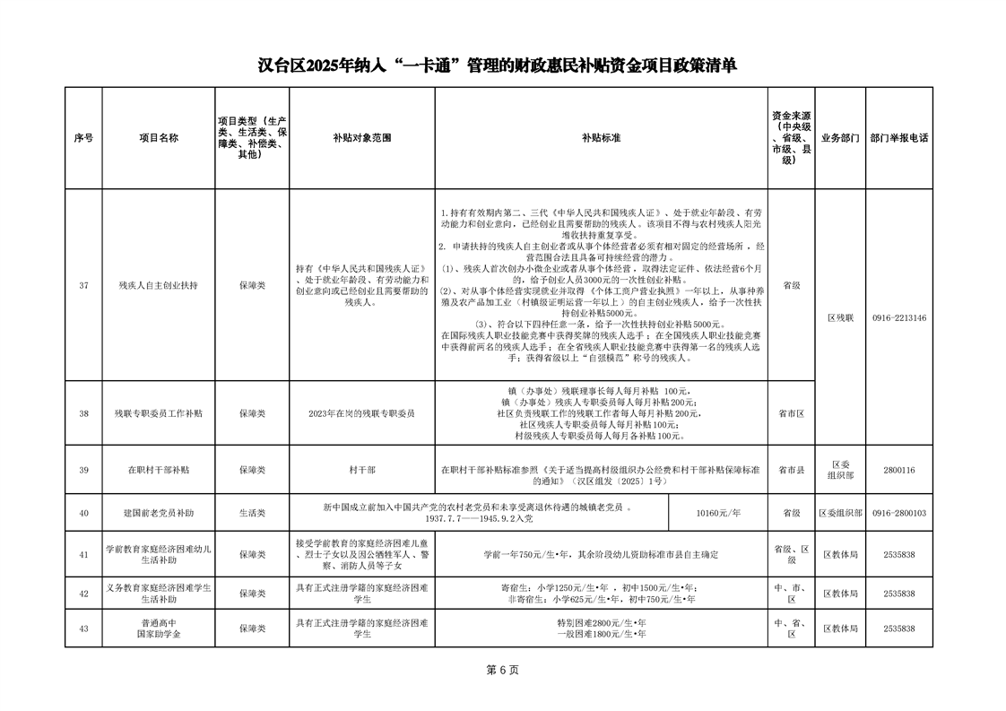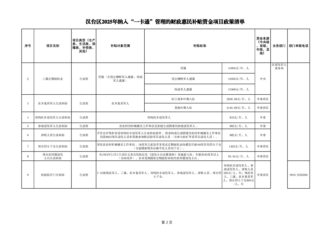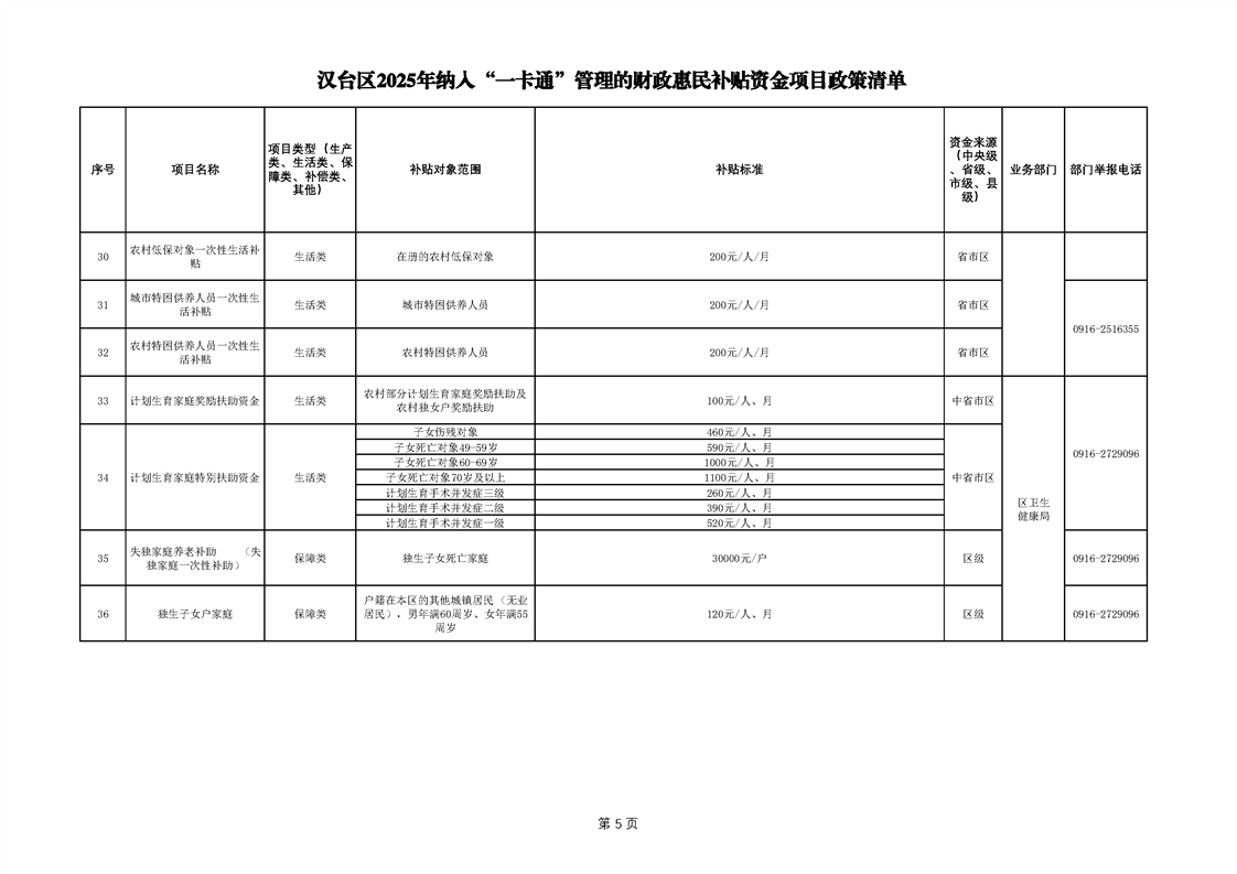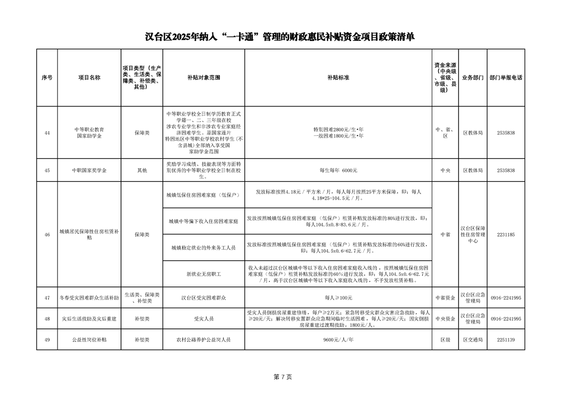 2025年漢臺區納入“一卡通”管理的財政惠民補貼資金項目政策清單