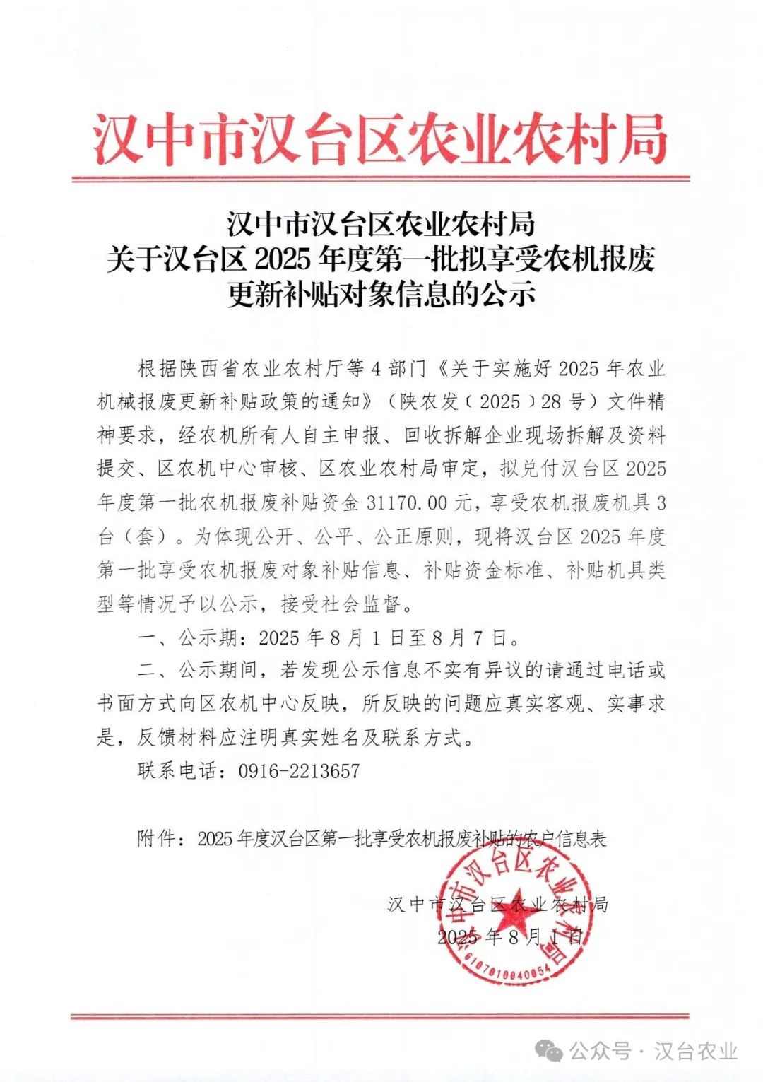 漢中市漢臺區農業農村局關于漢臺區2025年度第一批擬享受農機報廢更新補貼對象信息的公示