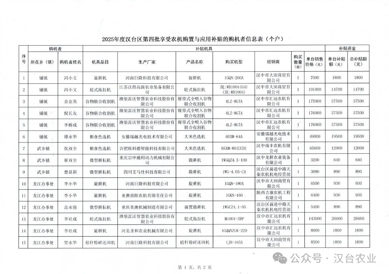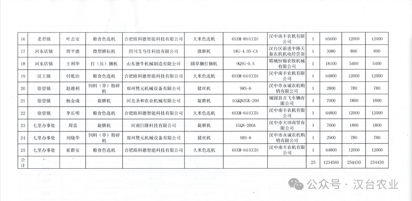 漢中市漢臺區農業農村局2025 年度漢臺區第四批(個戶)享受農機購置與應用補貼公示