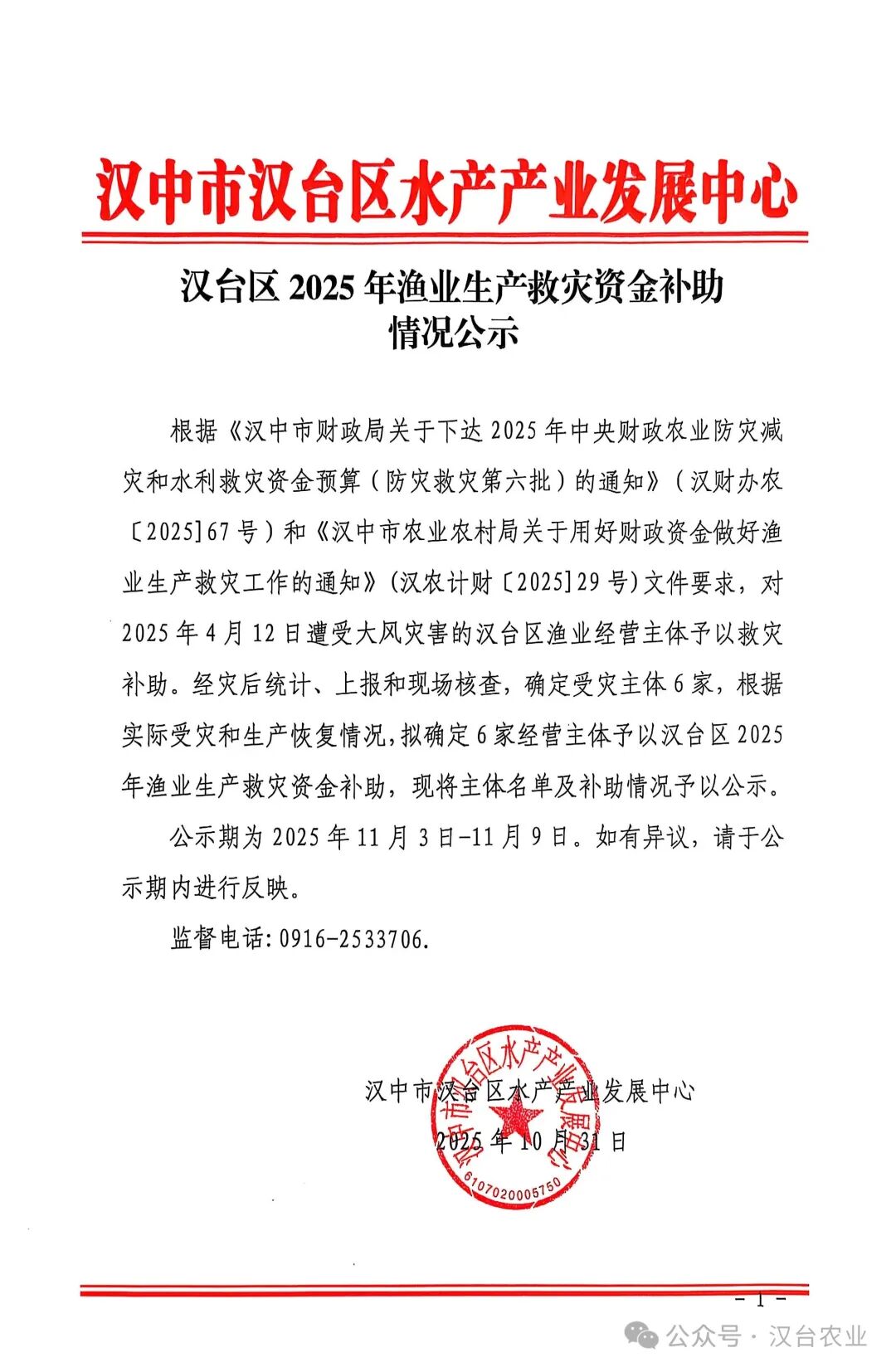 漢臺區2025年漁業生產救災資金補助情況公示