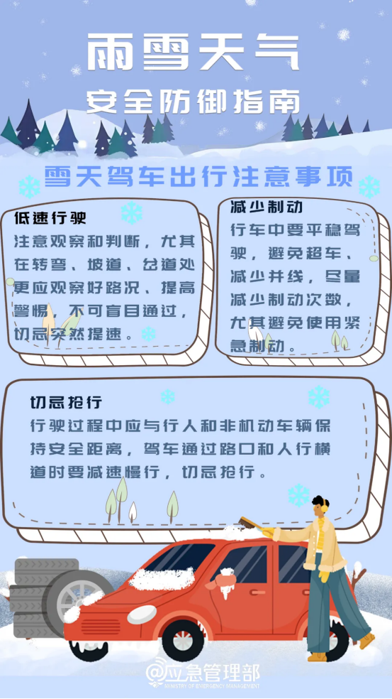 (1)雪天路滑請及時關注路況信息,盡量減少駕車出行。冰雪路面行車要集中注意力,保持安全車距,低速平穩(wěn)駕駛,不要隨意并線、超車。制動時采取點剎或降擋減速,轉向時要減速加大轉彎半徑,遇有情況提前減速,切忌急打方向、急踩剎車。
