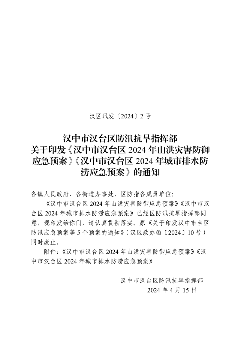 漢中市漢臺區防汛抗旱指揮部關于印發《漢中市漢臺區2024年山洪災害防御應急預案》《漢中市漢臺區2024年城市排水防澇應急預案》的通知
