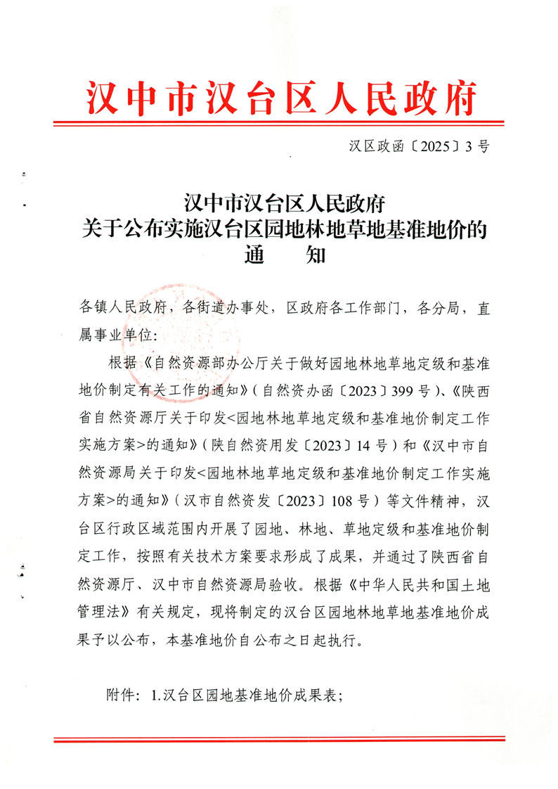 關于公布實施漢臺區園地林地草地基準地價的通知